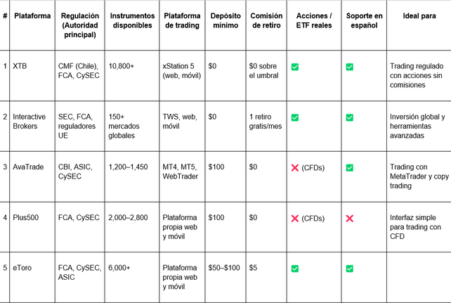 Los inversores en Chile pueden acceder a varias plataformas internacionales con diferentes costos, instrumentos y tipos de plataforma. Al comparar opciones, los factores más relevantes suelen ser la regulación, los costos de trading y el acceso a mercados globales.