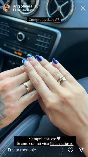 Mientras tanto, en las últimas horas, la novia de Facundo Farías, Angi Olivera, publicó una imagen donde confirma el compromiso de novios al que habrían llegado, con el regalo a la vieja usanza de las correspondientes alianzas.