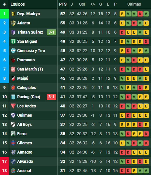 Otros resultados: San Telmo 3-Gimnasia (J) 2; Nueva Chicago 1-Agropecuario 0; Talleres (RE) 1-Chaco For Ever 0; Defensores de Belgrano 2-Central Norte 0.