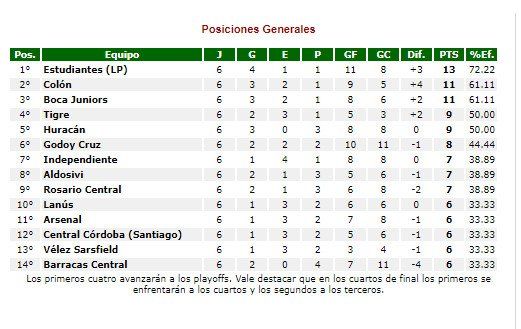 Mientras tanto, la tabla de posiciones de la Zona B lo encuentra a Colón afirmado en posiciones de clasificación, por el punto logrado en Lanús, y porque sus rivales en la pelea por llegar a ese grupo no pudieron aprovechar el empate que logró en las dos últimas jornadas
