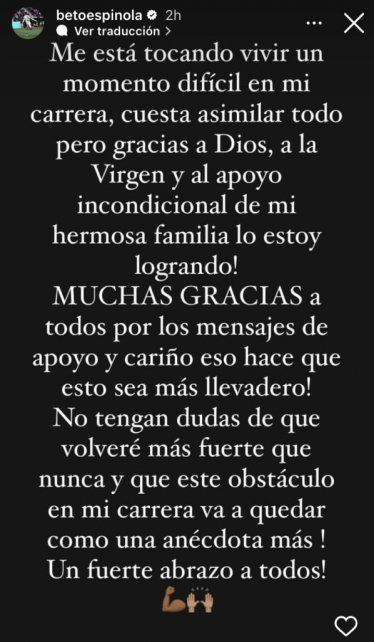 "Me está tocando vivir un momento difícil en mi carrera, cuesta asimilar todo pero gracias a Dios, a la Virgen y al apoyo incondicional de mi hermosa familia lo estoy logrando! MUCHAS GRACIAS a todos por los mensajes de apoyo y cariño eso hace que todo sea más llevadero! No tengan dudas de que volveré más fuerte que nunca y que este obstáculo en mi carrera va a quedar como una anécdota más! Un fuerte abrazo para todos", expresó.