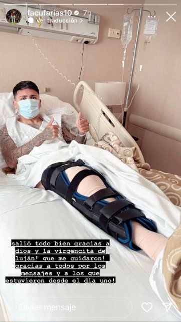 Mientras tanto, desde la clínica donde se encuentra internado en Buenos Aires, Facundo Farías realizó una publicación en su cuenta de Instagram, con una imagen donde se lo ve en la cama, con la rodilla operada. "Salió todo bien gracias a Dios y la virgencita de Luján! Que me cuidaron! Gracias a todos por los mensajes y a los que estuvieron desde el día uno!".