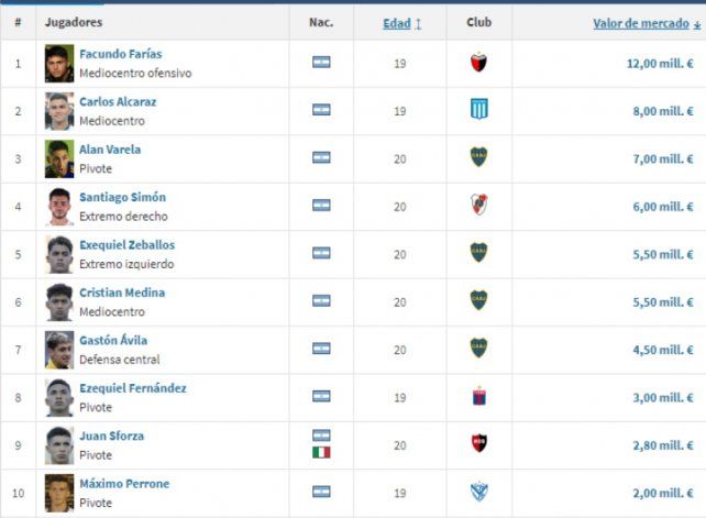 "El segundo lugar del listado lo ocupa Carlos Alcaraz de Racing, valuado en 8 millones de euros, y el podio lo completa Alan Varela, jugador de Boca que está cotizado en siete millones. Son cuatro xeneizes los que aparecen entre los primeros 10 puestos, ya que a Varela se suman Exequiel Zeballos, Cristian Medina y Gastón Avila. Santiago Simón es el único jugador de River que se encuentra entre estos lugares", se revela sobre los que le siguen a Facundo Farías, la Joya de Colón.