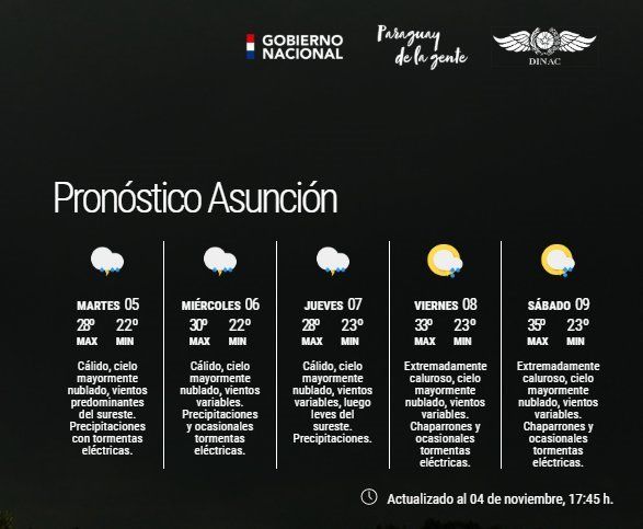 El sitio guaraní D10, reveló que "habrá inestabilidad climática desde el martes hasta el jueves con mínimas de 22° y máximas de 30°. Se prevé un día extremadamente caluroso con máximas que podrían alcanzar los 36 grados".