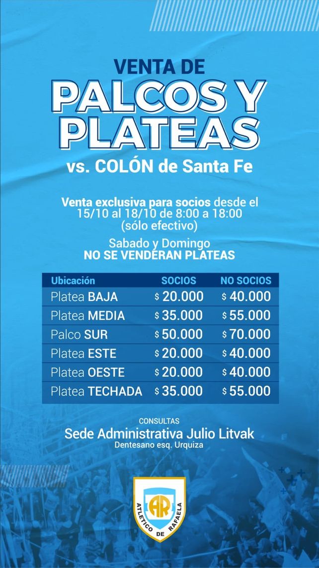 El expendio de boletos será de 8 a 18, en la sede administrativa Julio Litvak, aclarándose que el sábado y domingo no se venderán plateas.