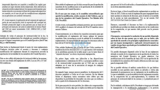 El argumento principal que expuso Colón, a través de Reck, tiene que ver en el cambio de reglamento del torneo en plena disputa (se quitó un descenso). El escrito argumenta que la modificación debió hacerse por el Comité Ejecutivo y no por Asamblea. Además, se refiere a que en la misma Asamblea no estaban todos los representantes presentes, ya que Talleres estaba ausente, por ejemplo. Y que cuando se modificó el descenso, el reglamento no especifica qué sucede si el mismo equipo es el último por promedios y por tabla general.