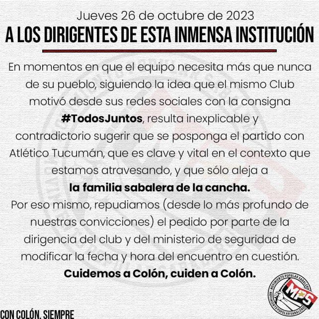 El Movimiento Popular Sabalero emitió un comunicado que difundió a los medios y seguidores donde rechaza de plano la posibilidad de gestionar un cambio de horario y día para recibir a Atlético Tucumán, último partido del año, a priori, en el estadio Brigadier López.