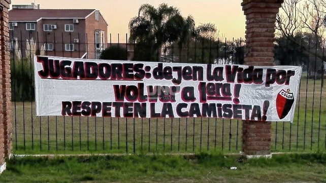 Sin embargo, este miércoles, en el retorno del plantel de Colón a los entrenamientos, con la mira puesta en el partido ante Gimnasia de Mendoza del próximo domingo, apareció en el Predio 4 de Junio, en su ingreso, una bandera con la siguiente leyenda: "JUGADORES: dejen la vida por volver a 1era! Respeten la camiseta!". La misma estuvo escrita con letras negras, con contorno rojo, y el escudo del club.