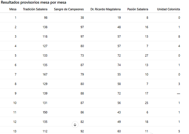 Si bien el recuento fue ajustado en algunas mesas, la tendencia se mantuvo firme durante todo el día: Tradición Sabalera se consolidó como la fuerza más votada y terminó sacando una diferencia clara sobre sus principales competidores, Sangre de Campeones y la lista Dr. Ricardo Magdalena, que se ubicaron segunda y tercera respectivamente.