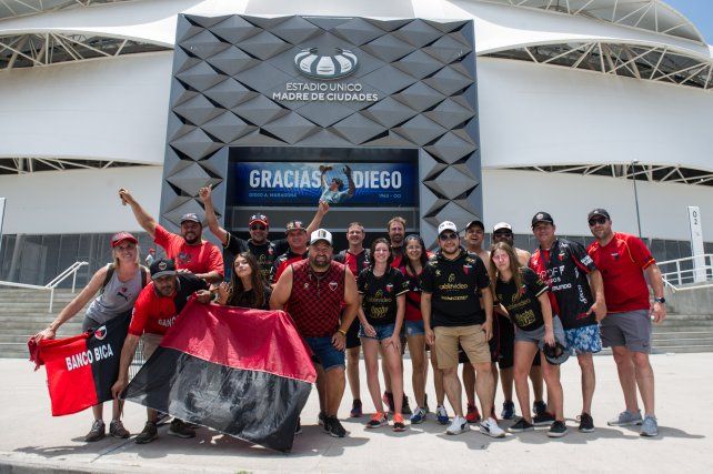 Muchos hinchas de Colón vinieron con familias completas y la mayoría, como si fuera un ritual, lo primero que hizo fue sacarse fotos en la entrada del Estadio único y en la estatua de Diego Maradona.