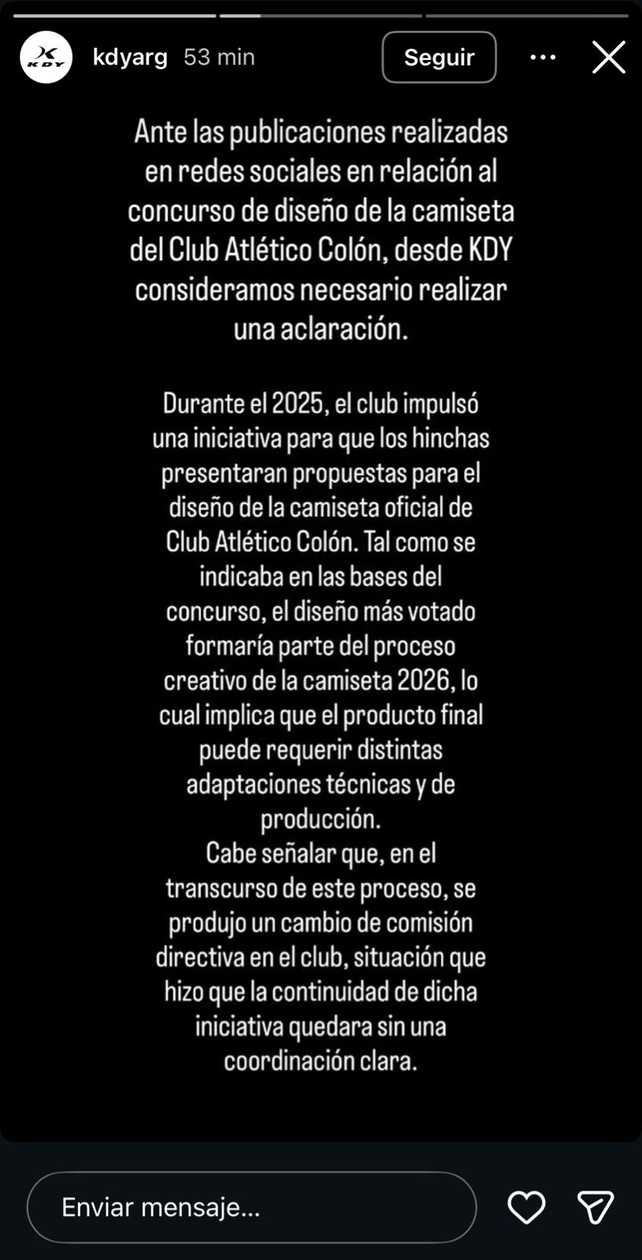 KDY recordó que durante 2025 el club lanzó una iniciativa para que los socios presentaran propuestas para la camiseta oficial. El diseño ganador, de Matías Canavese, integró el desarrollo creativo de la indumentaria 2026. Sin embargo, la marca aclaró que durante el proceso se produjo un cambio de comisión directiva en el club, lo que provocó que la continuidad y coordinación de la iniciativa se viera afectada y sin un liderazgo claro.