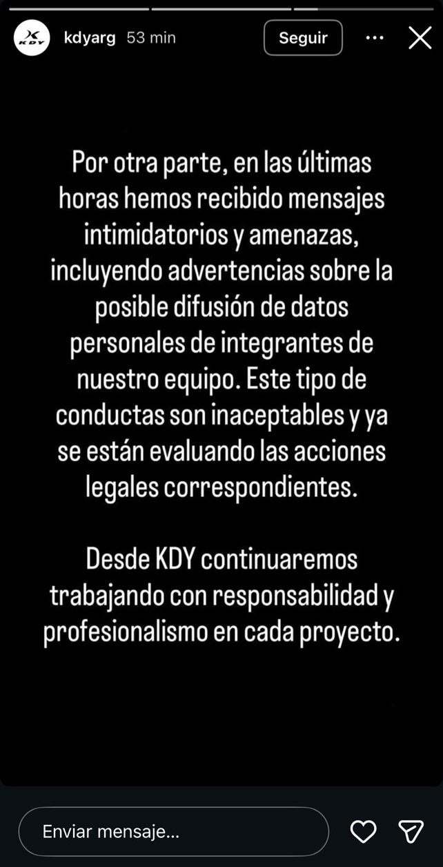 El comunicado también hizo referencia a la recepción de mensajes intimidatorios y amenazas dirigidas a la marca, incluyendo advertencias sobre la posible difusión de datos personales del equipo de trabajo. KDY calificó estas conductas como inaceptables y adelantó que se están evaluando acciones legales correspondientes. Por último, KDY reafirmó que seguirá trabajando con responsabilidad y profesionalismo en cada proyecto, en un intento de preservar la confianza y la relación con el club y los hinchas.
