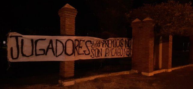 En las últimas horas hubo dos hechos que no pasaron desapercibidos. Por un lado, un pasacalle colgado en el predio para los jugadores, en alusión al tema de los premios, y otro que amaneció este miércoles colgado en la sede, este en referencia al accionar de José Vignatti.