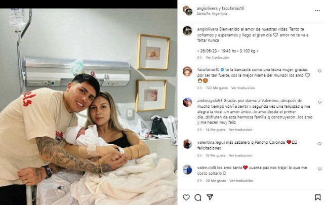 "Bienvenido al amor de nuestras vidas. Tanto te soñamos y esperamos y llego el gran día amor no te va a faltar nunca • 26/06/23 • 19:45 hs • 3,100 kg •", compartió Angie Olivera, en conjunto con Facundo Farías, en Instagram. El jugador de Colón luego escribió: "te la bancaste como una leona mujer, gracias por ser tan fuerte, sos la mejor mamá del mundo! los amo".
