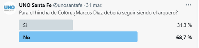 Por este motivo, UNO Santa Fe le consultó a sus lectores y seguidores en redes sociales sobre cuál es el pensamiento, en cuanto a si Marcos Díaz debería seguir siendo o no el arquero de Colón. El 68.7% de los fanáticos sabaleros creen que llegó el momento de un cambio de arquero.
