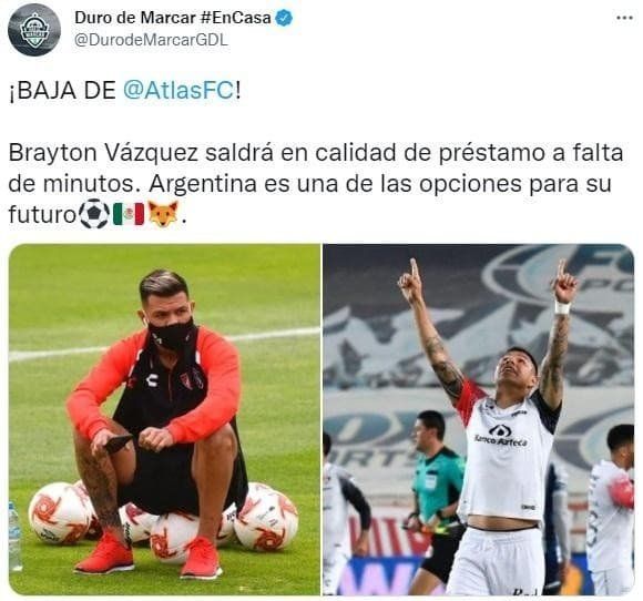 "De acuerdo al sitio de deportes de Jalisco TV, Duro de Marcar, Brayton Vázquez causará baja en los Zorros por falta de participación y saldría hacia la Argentina cedido a préstamo. «¡BAJA DE ATLAS! Brayton Vázquez saldrá en calidad de préstamo a falta de minutos. Argentina es una de las opciones para su futuro», escribieron en su Twitter", indica dicho portal.