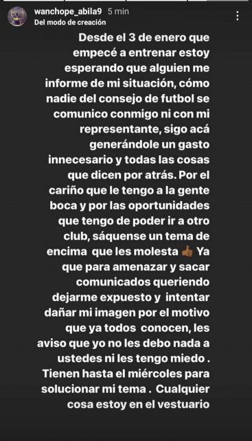 Ya que para amenazar y sacar comunicados queriendo dejarme expuesto e intentar dañar mi imagen por el motivo que ya todos conocen, les aviso que yo no les debo nada a ustedes ni les tengo miedo. Tienen hasta el miércoles para solucionar mi tema. Cualquier cosa estoy en el vestuario.