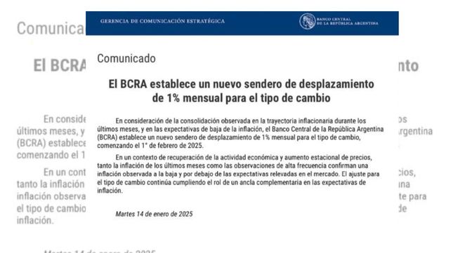 Tras conocerse la inflación anual, Banco Central de la República Argentina (BCRA) anunció un nuevo sendero de ajuste para el tipo de cambio oficial, que pasará de una devaluación mensual del 2% al 1%. Según el comunicado oficial, la decisión responde a la “consolidación de la trayectoria inflacionaria” y a las expectativas de estabilización de precios en los próximos meses.