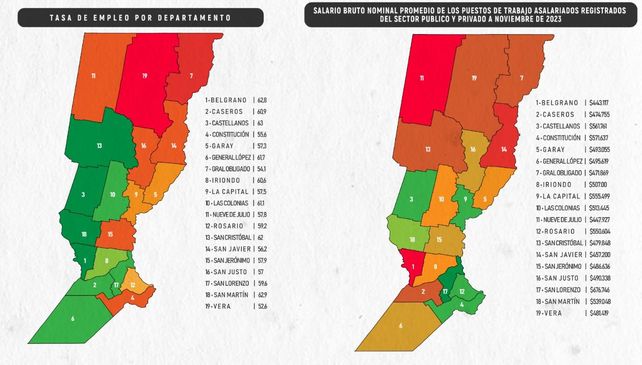 “Seis departamentos se ubican por encima del salario promedio provincial de los asalariados registrados: San Lorenzo, Constitución, Castellanos, La Capital, Rosario y San Martín. Mientras que Belgrano, 9 de Julio y San Javier exhiben los menores salarios, que se ubican en promedio un 17% por debajo del valor provincial y 34% por debajo del mayor valor que corresponde al departamento San Lorenzo ($676.746)”, enumera el relevamiento.