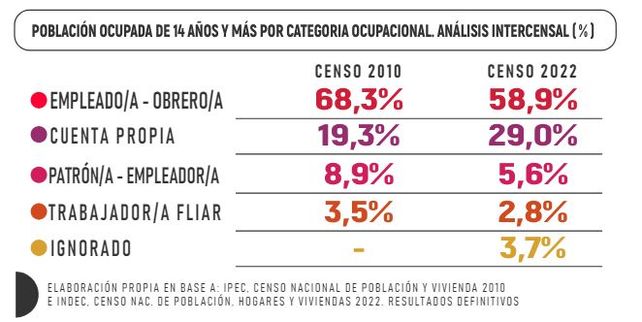 Los datos publicados por Blanco y el equipo técnico de la comisión de Legislación Laboral destacaron que la población asalariada a la que no le descuentan ni aportan jubilación era de 30,9% (en 2010) mientras que hoy se ubica en los 32,3%, a la vez que el trabajo por cuenta propia pasó del 19,3% en 2010 al 29% en 2022. La población que posee cobertura de salud no varió en la última década (el 28,5% y un 28,6% en 2010 y 2022, respectivamente). Es decir, uno de cada tres trabajadores se encuentra sin aportes jubilatorios ni cobertura de salud “producto del aumento de la informalidad laboral”.