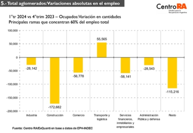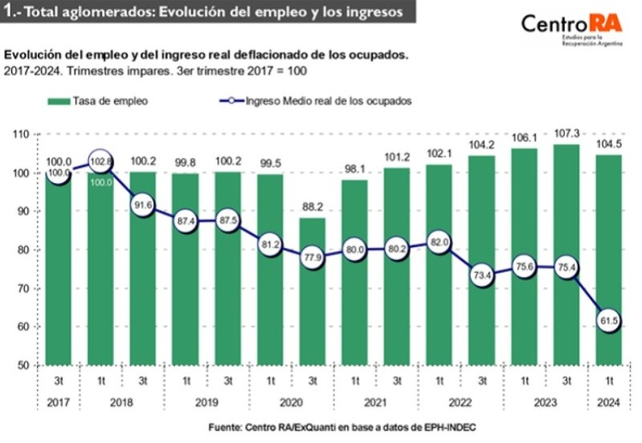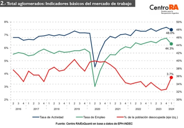 Además de destacar el alto porcentaje de trabajadores que son pobres, el informe del Centro RA también advierte sobre el aumento del 32,4% en la tasa de desocupación entre el cuarto trimestre de 2023 y el primero de 2024. En ese lapso perdieron sus trabajos 265.950 personas, dejando un total de 1.088.000 desempleados.