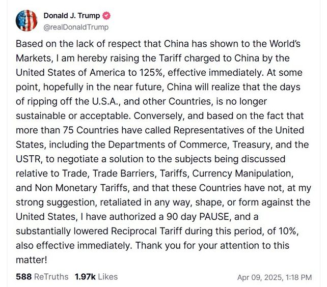 La novedad se conoció a través de un post del presidente en la red social X: "Debido a la falta de respeto que China ha mostrado hacia los mercados mundiales, por la presente, aumento el arancel que Estados Unidos le impone a China al 125 %, con efecto inmediato. En algún momento, ojalá en un futuro próximo, China se dará cuenta de que la época de estafar a Estados Unidos y a otros países ya no es sostenible ni aceptable. Por otro lado, y considerando que más de 75 países han convocado a representantes de Estados Unidos, incluyendo los Departamentos de Comercio, Tesoro y la Oficina del Representante Comercial de Estados Unidos (USTR), para negociar una solución a los temas en discusión en relación con el comercio, las barreras comerciales, los aranceles, la manipulación de divisas y los aranceles no monetarios, y que estos países no han tomado represalias de ninguna manera contra Estados Unidos, a sugerencia mía, he autorizado una pausa de 90 días y una reducción sustancial del arancel recíproco durante este período, del 10%, con efecto inmediato. Gracias por su atención a este asunto".