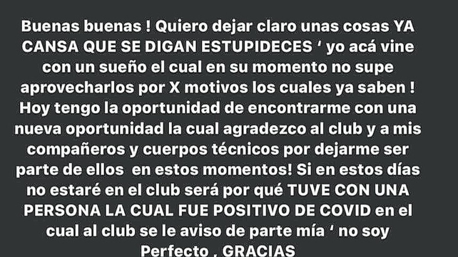 Buenas buenas! Quiero dejar claro unas cosas, YA CANSA QUE SE DIGAN ESTUPIDECES, yo acá vine con un sueño el cual en su momento no supe aprovecharlo por X motivos, los cuales ya saben!. Hoy tengo la oportunidad de encontrarme con una nueva oportunidad, la cual agradezco al club y a mis compañeros y cuerpos técnicos por dejarme ser parte de ellos en estos momentos!. Si en estos días no estaré en el club será porque ESTUVE CON UNA PERSONA LA CUAL FUE POSITIVO DE COVID, por lo cual al club se le avisó de parte mía, no soy Perfecto, GRACIAS. Esa es mi verdad y por eso hasta el jueves no estaré en el club!. Hablé con Julio y pudo comprenderme y para mí eso es muchísimo y mis compañeros también, gracias por entenderlo.