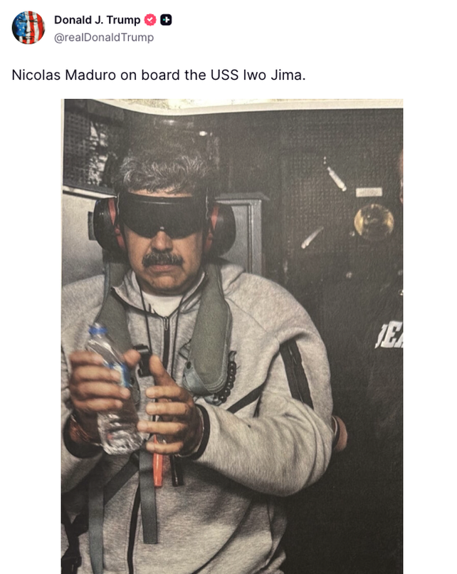 "Nicolás Maduro a bordo del USS Iwo Jima", escribió Trump y adjuntó la foto donde se lo ve esposado y unas gafas negras que limita su visión. Además, se lo puede ver con una botella de agua mineral en la mano.