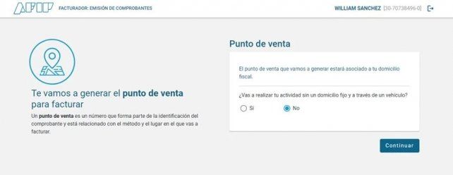 En caso de no tener puntos de venta creados con anterioridad, será necesario indicar si la actividad se desarrollará en un domicilio fijo o no. Luego, presionar CONTINUAR.