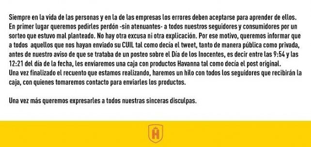 Luego afirmaron: "A todos aquellos que nos hayan enviado su CUIL tal como decía el tweet, tanto de manera pública como privada, antes de nuestro aviso de que se trataba de un posteo sobre el Día de los Inocentes, es decir entre las 9:54 y las 12:21 del día de la fecha, les enviaremos una caja con productos Havanna tal como decía el post original".