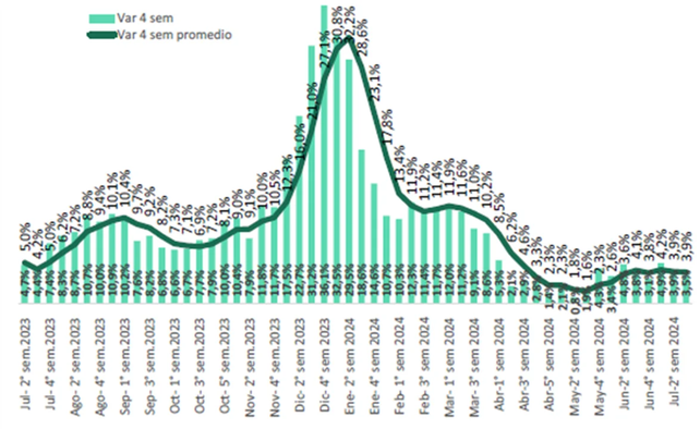 En las últimas cinco semanas, los índices mensuales móviles que toman en cuenta el promedio de las últimas cuatro semanas dan cuenta de mediciones que fluctúan entre los 3,8% y 4,2%.