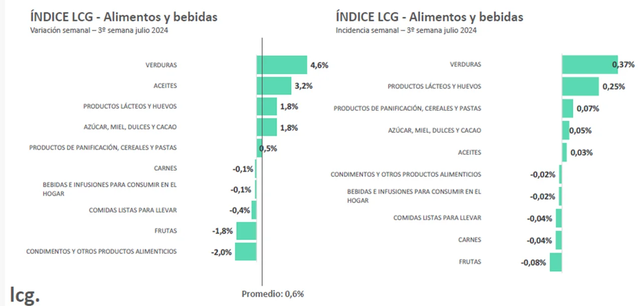 La tercer semana de julio registró una inflación del 0,6% en alimentos y bebidas, según midió la consultora LCG. Tras una aceleración de 1,8% semanal en la primera semana de julio, donde se evidenció el impactó del salto de los dólares libres, las siguientes dos semanas marcaron 0,5% y 0,6% respectivamente.