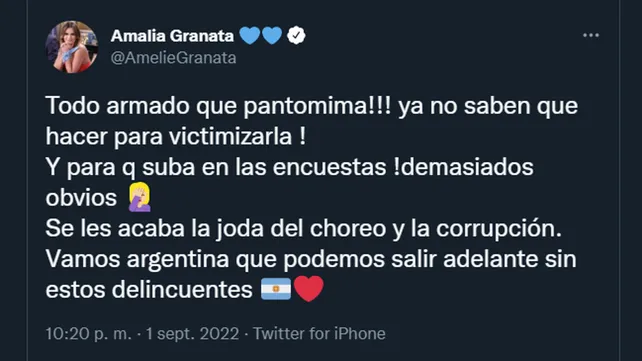 "¡Todo armado, qué pantomima! Ya no saben qué hacer para victimizarla", escribió en su cuenta de Twitter Granata, para añadir que fue hecho "para que suba en las encuestas. Demasiado obvios".