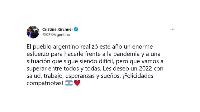 "Antes que termine el año quiero compartir el mensaje de este sacerdote chileno que también aplica a la Argentina", escribió la vicepresidenta en la noche del 31 de diciembre en su cuenta de Twitter, donde horas antes había publicado un saludo por fin de año.