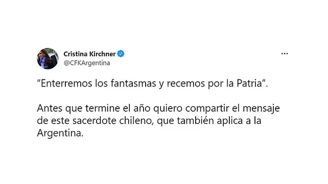 La vicepresidenta Cristina Fernández de Kirchner pidió "enterrar los fantasmas" y "rezar por la Patria", en una publicación que hizo en sus redes sociales con motivo del Año Nuevo, donde difundió el video de un sacerdote chileno que citó esa frase.
