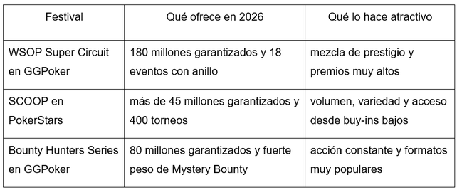 Lo curioso en el caso de 2026 es que los operadores no sólo venden grandes premios, sino que se van construyendo festivales mucho más llevaderos de seguir, que mucha gente sabe disfrutar. GGPoker ha anexado, a su WSOP Super Circuit, 3 millones en drops de free ticket y PokerStars ha acompañado SCOOP de free tickets promocionales y muchas vías de clasificación barata. Así se entiende cómo es que estos festivales despiertan el interés incluso días después de su lanzamiento y convierten la serie en una suerte de rutina cotidiana. En GGPoker se aprecia de una forma muy clara, con el siguiente movimiento del calendario.
