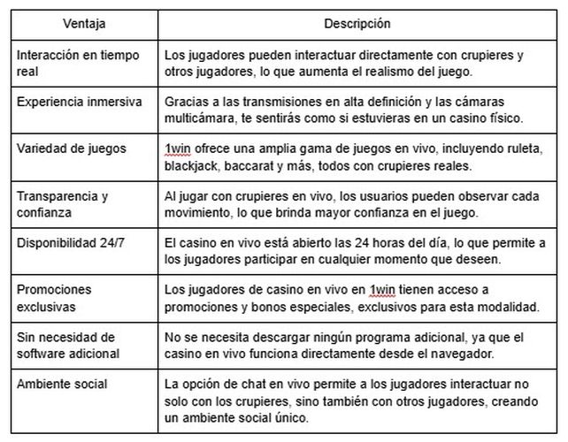 Como puedes ver, jugar en el casino en vivo de 1win ofrece una serie de beneficios que van más allá de los juegos convencionales. La oportunidad de interactuar con crupieres profesionales y otros jugadores crea una experiencia más cercana y realista, similar a la que encontrarías en un casino físico. Además, la amplia disponibilidad y las promociones exclusivas para esta modalidad lo convierten en una opción irresistible para los jugadores que buscan algo más que simples juegos en línea.