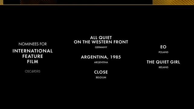 El filme, que podría compartir el logro obtenido por "La historia oficial" (1985) y "El secreto de sus ojos" (2009), disputará el galardón con "Sin novedad en el frente" (Alemania, de Edward Berger), "Cerca" (Bélgica, de Lukas Dhont), "EO" (Polonia, Jerzy Skolimowski) y "The Quiet Girl" (Irlanda, hablada en gaélico, de Colm Bairéad).