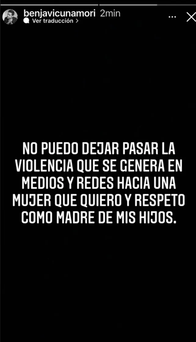 Cuando los embates contra la actriz, actualmente en España, iban creciendo en intensidad, Benjamín Vicuña, ex de la China, alzó su voz en las redes sociales. “No puedo dejar pasar la violencia que se genera en medios y redes hacia una mujer que quiero y respeto como madre de mis hijos”, escribió en la madrugada del miércoles en un historia de Instagram, en blanco sobre negro como la que había posteado la esposa del jugador del Paris Saint-Germain.