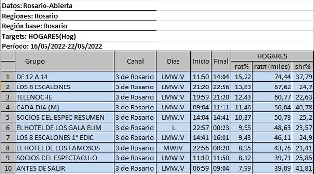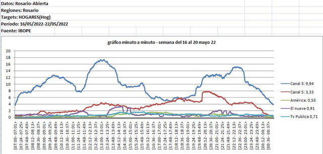 El canal de la ciudad de Rosario lleva alcanzada una audiencia de 3 millones de personas. Los 10 programas más vistos de Rosario están en Canal 3: “Antes de Salir”, “Cada Día”, el ya clásico “De 12 a 14”, con más de 35 años en el aire, y “Telenoche”. Desde el canal, explicaron que se trata de programas de producción local que lideran la audiencia y marcan la agenda de la ciudad de Rosario, consignó totalmedios.com.
