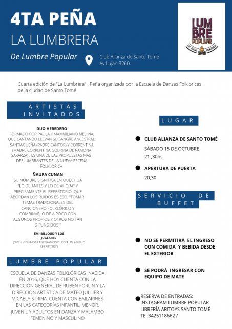 Este sábado 15 de octubre en el club Alianza de la ciudad de Santo Tomé (avenida Luján 3260), se llevará a cabo la cuarta edición de "La Lumbrera", peña organizada por la Escuela de Danzas Folklóricas Lumbre Popular. Las puertas se abrirán a las 20.30 y las entradas se puede reservar por redes den el Instagram de Lumbre Popular o en librería Aritoys (Santo Tomé) 342 5118662