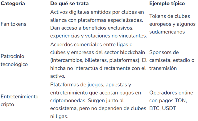 Conviene tener claro que "cripto en el deporte" abarca tres realidades muy distintas, que a veces se mezclan en una misma conversación: