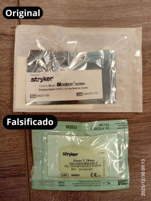 La firma Stryker Corporation figura como titular del producto mencionado, que se encuentra registrado ante Anmat bajo el PM 594-139. Luego de la inspección, se exhibió la muestra recolectada ante la responsable técnica de dicha firma, quien afirmó que se trataba efectivamente de un producto falsificado.