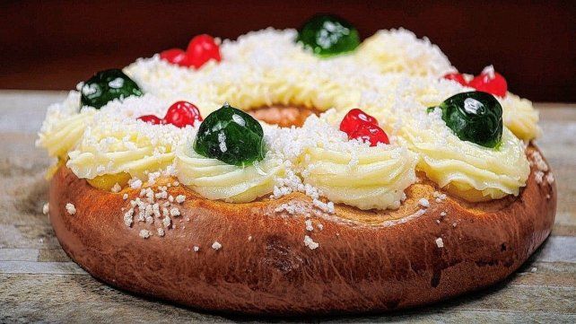La rosca de Reyes lleva una masa a base de leche, manteca y levadura y está recubierta con crema pastelera espesa, para que no se funda con el calor del horno.