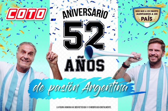 Desde el 29 de septiembre y hasta el 20 de Noviembre del 2022 inclusive, COTO festeja 52 años de pasión argentina con un gran Sorteo de 2.000 órdenes de compras de $40.000 c/u. Junto con este espectacular Sorteo, que sin dudas es “La jugada del año”, COTO lanza un nuevo spot que tiene como protagonista a una dupla muy popular en el mundo futbolero: el ex jugador campeón del mundo Oscar Ruggeri y el periodista deportivo Sebastián “El Pollo” Vignolo.