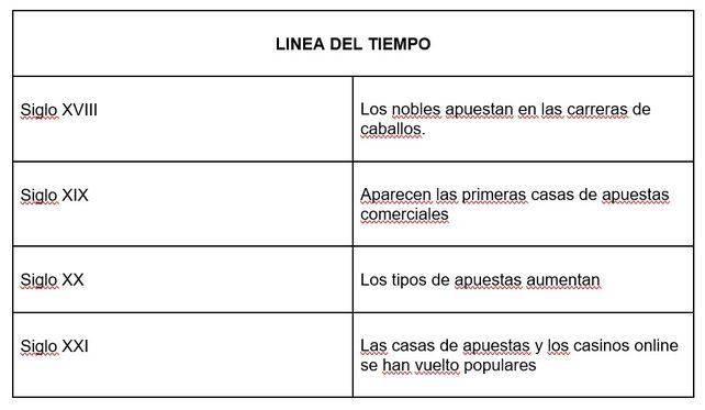 En el siglo XX las apuestas empezaron a ganar más eventos y ya no se limitaban únicamente a las apuestas deportivas. Y para concluir nuestro pequeño recorrido en el tiempo, con la llegada del siglo XXI surgieron las famosas casas de apuestas online, ligadas a la expansión y facilidad de la conexión a internet. Consulta la línea del tiempo:
