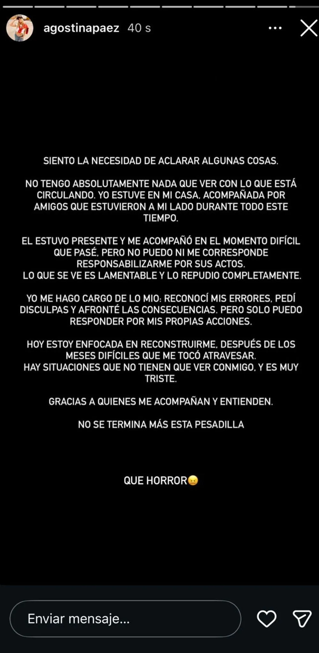 Tras la revelación del video, Agostina Páez salió a desligarse de las actitudes de su padre. "No se termina más esta pesadilla", aseveró.