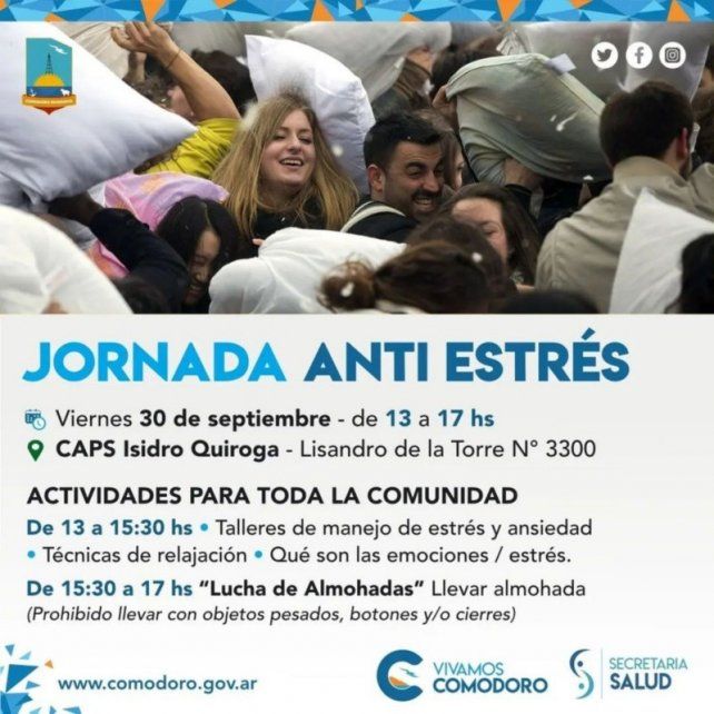 En el marco de una serie de iniciativas para concientizar sobre la salud mental, el estrés y la tensión, la secretaría de Salud de Comodoro Rivadavia (Chubut) organizó una "lucha de almohadas". La insólita propuesta rápidamente se difundió a nivel nacional. ¿Algún otro municipio copiará la medida? La jornada se llevará a cabo este viernes de 13 a 17, en la sede del Centro de Atención Primaria de Salud.