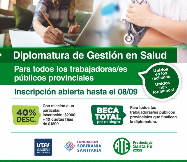 La Diplomatura de Gestión en Salud es fruto de un Acuerdo de Cooperación entre ATE Santa Fe, la Universidad Nacional de Avellaneda y la Fundación Soberanía Sanitaria.