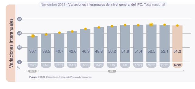 El índice de Precios Minoristas aumentó durante noviembre 2,5%, informó hoy el Instituto Nacional de Estadística y Censos (Indec). En cuanto a la inflación en la categoría de variación interanual, comparando noviembre de 2020 respecto a noviembre 2021 los precios aumentaron un 51,2 %.